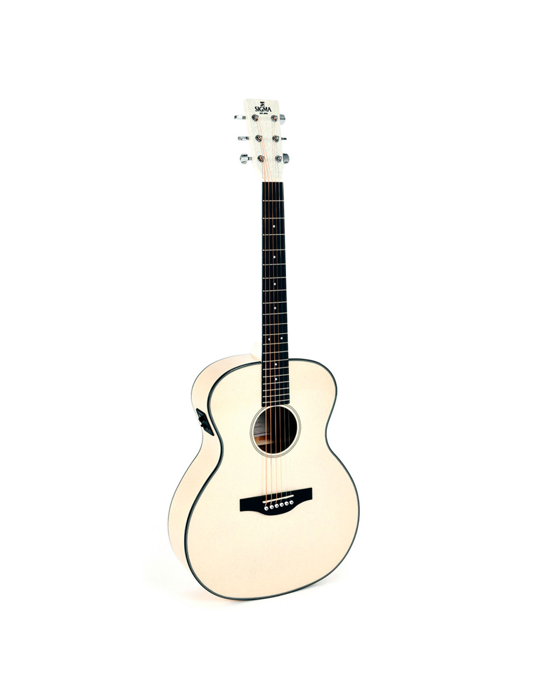 Chitarra 6 corde grand OM elettrificata - 1 Glitter Series - Lunghezza scala: 645mm - Costruzione: dovetail neck joint - Top: abete sitka massello - Fondo: mogano - Fasce: mogano - Manico: mogano low profile - Ponte: micarta - Tastiera: micarta - Attacco tastiera su cassa: 14mo tasto - Truss-rod: due vie - Capotasto: osso 44,5mm - Traversino: osso - Binding top: black/white - Binding fasce: nero - Rosetta: black/white - Dots in pearloid - Meccaniche: diecast cromate - Colore: metallic flake white/silver - Finitura: polished gloss - Elettrificazione: Fishman Presys II (Equalizzatore 2 Bande + Phase + Volume + Accordatore).