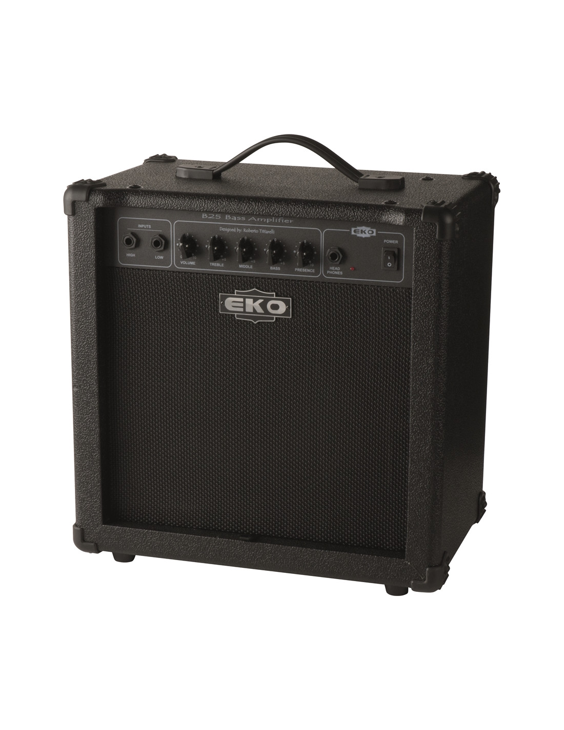L'amplificatore per basso B 25 nasce dalla collaborazione fra Eko Guitars e il genio tecnico di Roberto Tittarelli che danno vita ad un prodotto con un ottimo rapporto qualità-prezzo e un'ottima verstilità timbrica. Due ingressi, attivo e passivo, cono da 8" e 25 Watt di potenza.