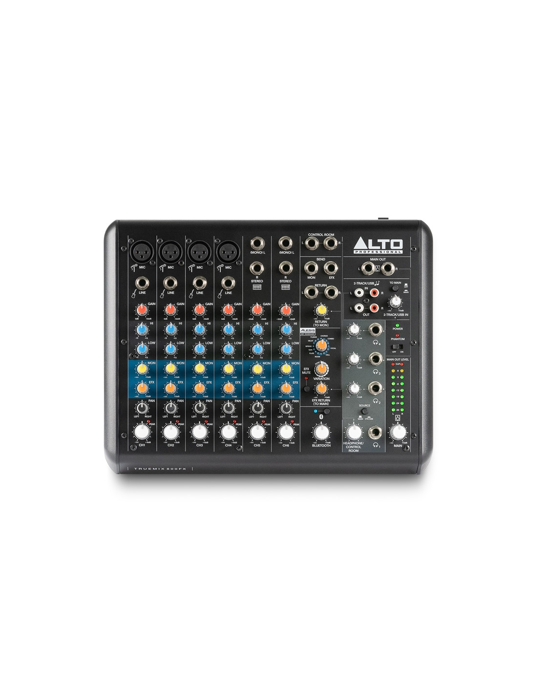 Mixer analogico a 7 canali con processore a 16 effetti: 4 mono (Mic/Instrument), 2 stereo line e 1 canale stereo Bluetooth. Gain, equalizzatore 2 bande (basse e alte), Pan e mandate Aux e FX su ogni canale. 4 uscite cuffia con controlli di volume separati. Ingressi line bilanciati, Phantom attivabile sugli ingressi microfonici. Ingresso e uscita stereo 2-TRACK su connettori RCA con routing indirizzabile verso Main Mix o uscita cuffia. Porta USB audio class compliant che aggiunge al tuo computer PC, Mac e altri device un ingresso e un'uscita stereo. Led meter ad 8 segmenti.